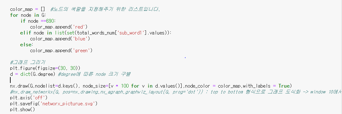 G.degree 는 각 노드의 연결 횟수를 반환합니다. 하지만 최신버전부터 dictionary 형태로 반환되지 않기 때문에 dict(G.degree) 로 저장을 해서 nodelist = d.keys() 에 넘겨주도록 합니다. 이를 통해 각 노드의 연결횟수에 따라 노드의 크기를 자동으로 지정할 수 있습니다.