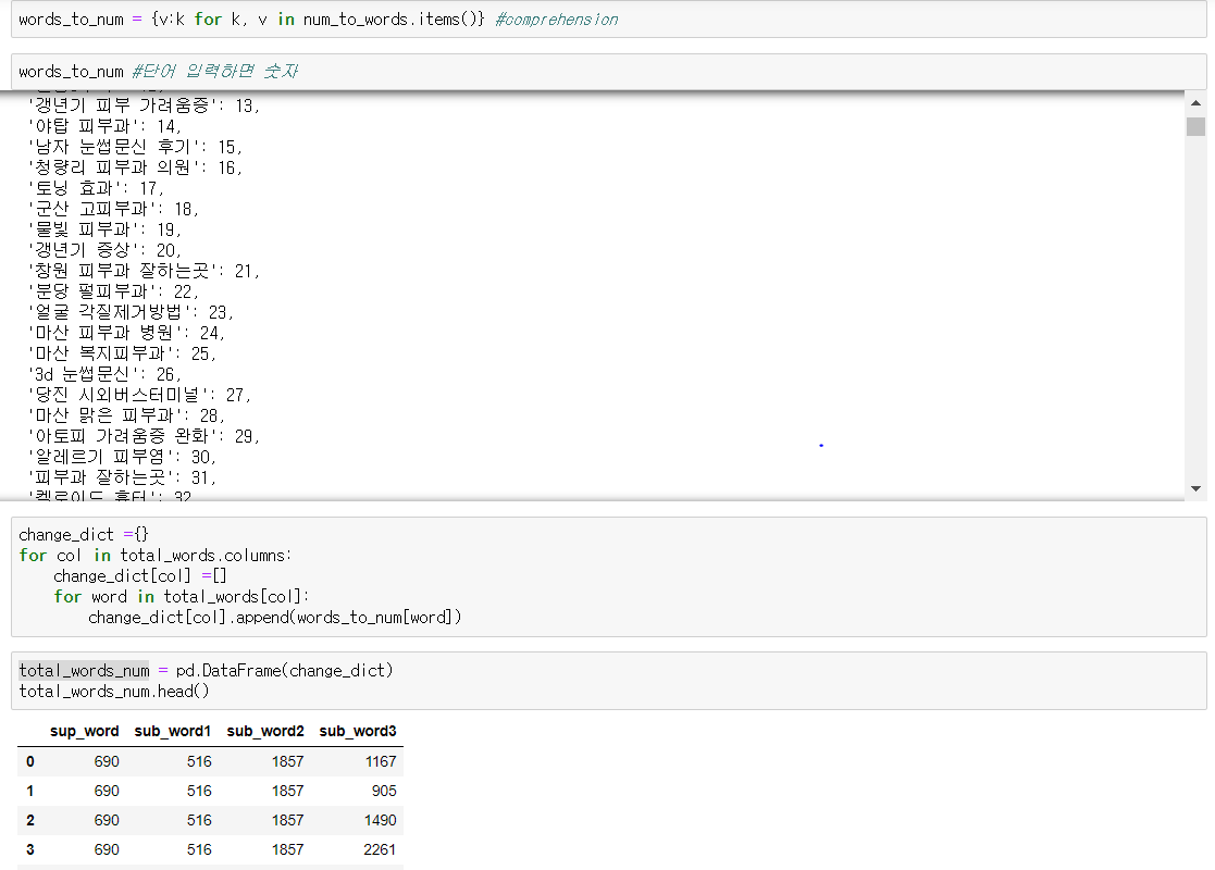 최종적으로 단어를 숫자로 대체한 total_words_num 이라는 데이터 프레임을 사용하였습니다.