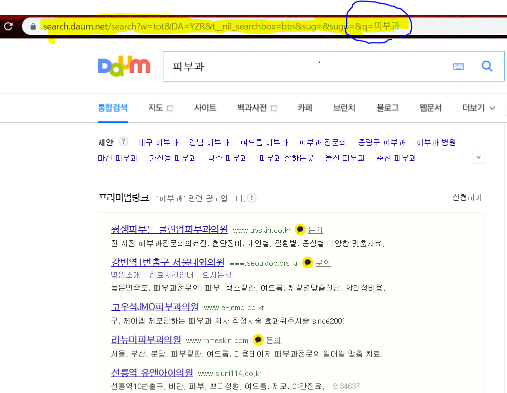 우리가 매일 접하는 네이버, 다음과 같은 사이트에서 상단의 URL 을 보시면 우리가 '피부과' 라는 검색어를 검색하고 싶을 때 https://search.daum.net/search?w=tot&DA=YZR&t__nil_searchbox=btn&sug=&sugo=&q=피부과 와 같이 URL에 우리가 원하는 정보를 결합하여 서버에 요청합니다. 이러한 방식이 바로 GET 방식입니다.